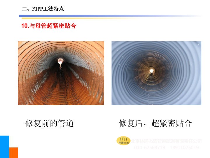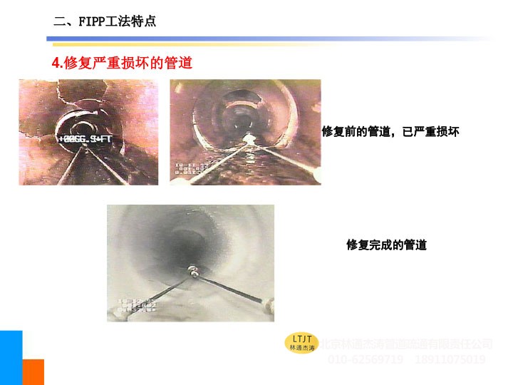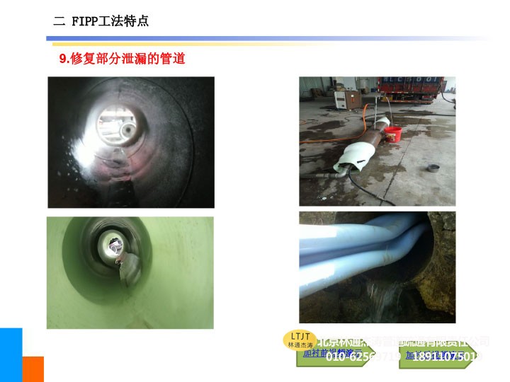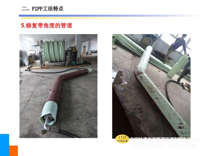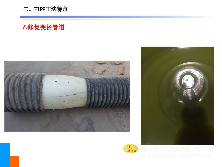 2、可修复存在管道错口(5cm以内)的管道及小于45°的弯曲管道,亦可修复变径管道及形状不规则的管道。