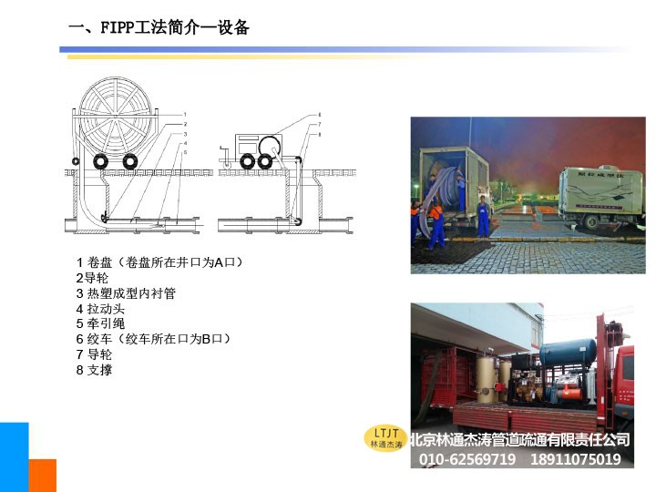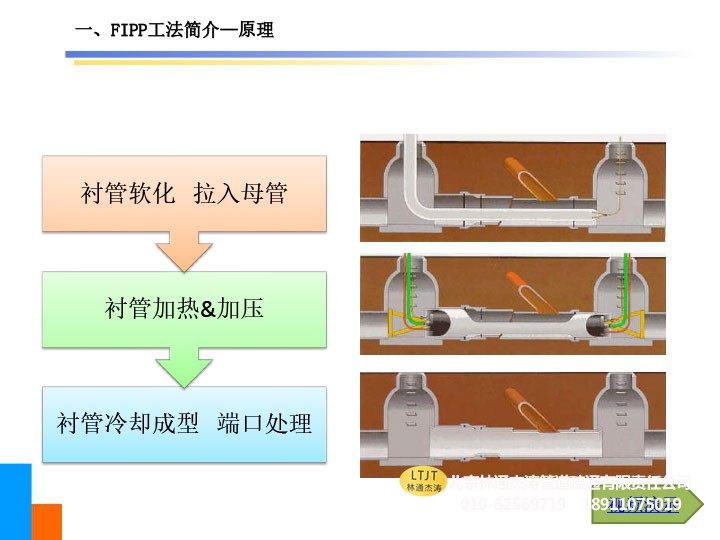热塑成型(FIPP)非开挖管道修复工艺是将预制好的内衬管在专用设备上进行加热软化,之后牵引至管道内部,再对内衬管内部进行加热加压使恢复原直径或膨胀,使其与原管道紧密贴合,然后通入常温气体或冷气使其冷却成型,形成一层新的内衬管。